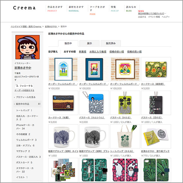 ハンドメイドマーケット、creema内のショップ。